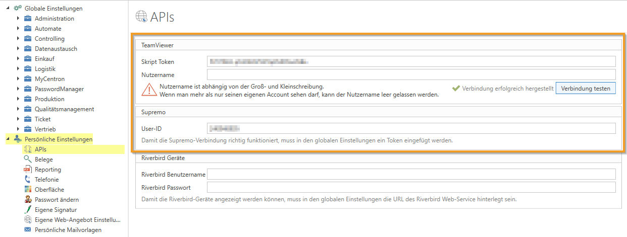 APIs and Integrations: To integrate external tools such as Microsoft Teams, TeamViewer, and Supremo, API keys or script tokens must be entered in each employee’s personal settings under “APIs.”