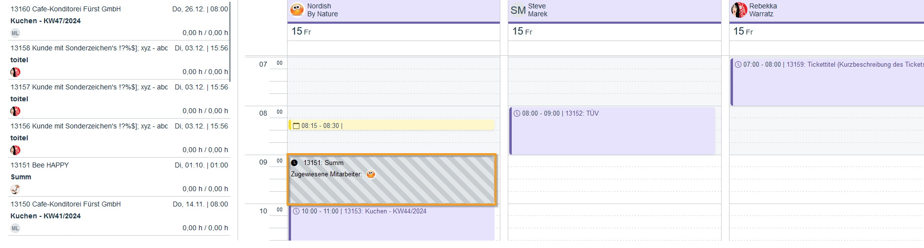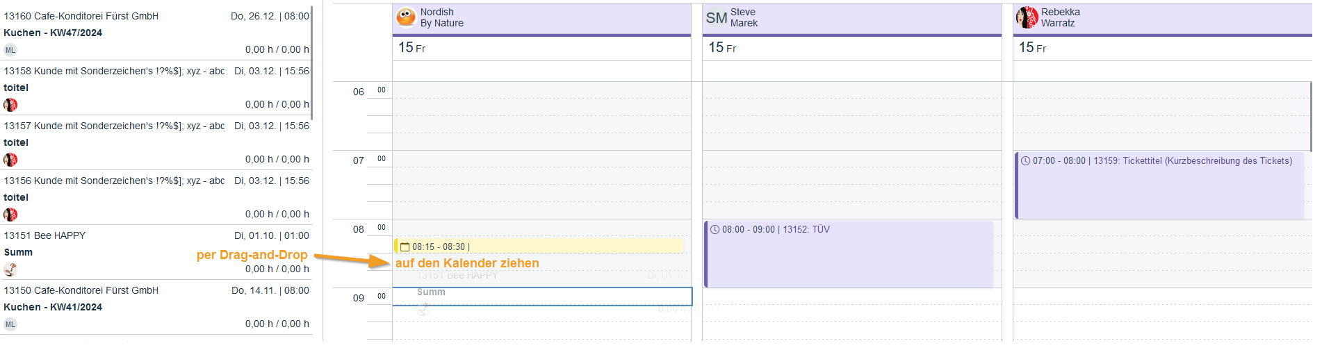 Tickets with the corresponding status are displayed and can be dragged and dropped onto the calendar.