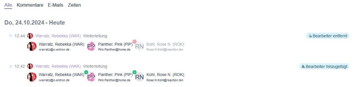 History offers a A comprehensive overview of all past promotions within a ticket, such as changes, recorded times, or sent emails. It effectively supports the tracking and documentation of ticket activities, ensuring transparency regarding the processing history at all times.