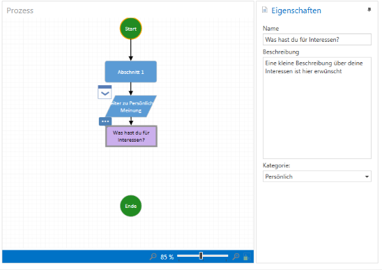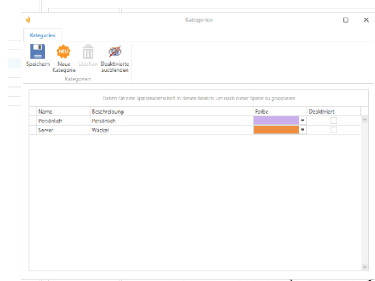 These freely defined categories with name, description, and color can be created and managed individually. These categories can be stored in the properties of each questionnaire module, except for Info and Subsection.