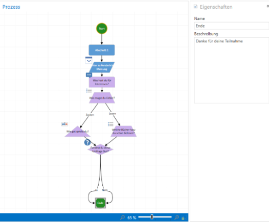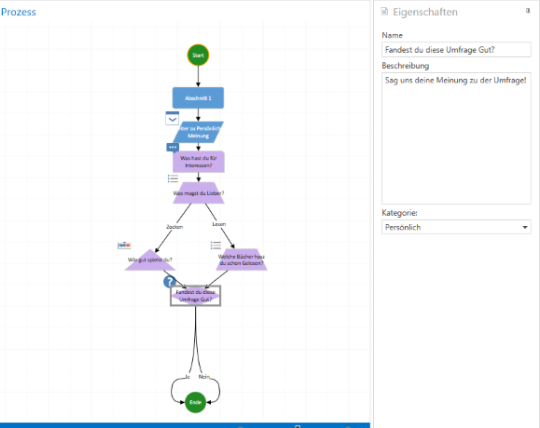 ·Generate connection: As with the question "What do you like better?", a connection is generated for each possible answer, which then takes a new path in the survey with each answer. This allows new paths to be created.