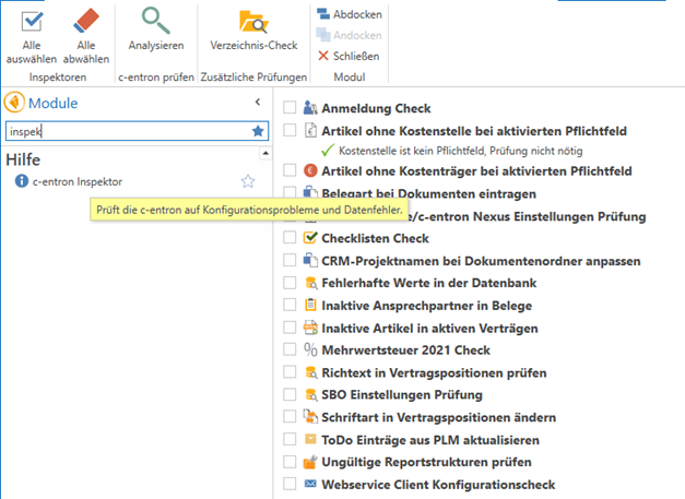 The "c-entron Inspector" module is used to continuously check the current configuration of c-entron. It is continuously expanded with additional test and SQL fix routines to ensure a comprehensive analysis of the system configuration.