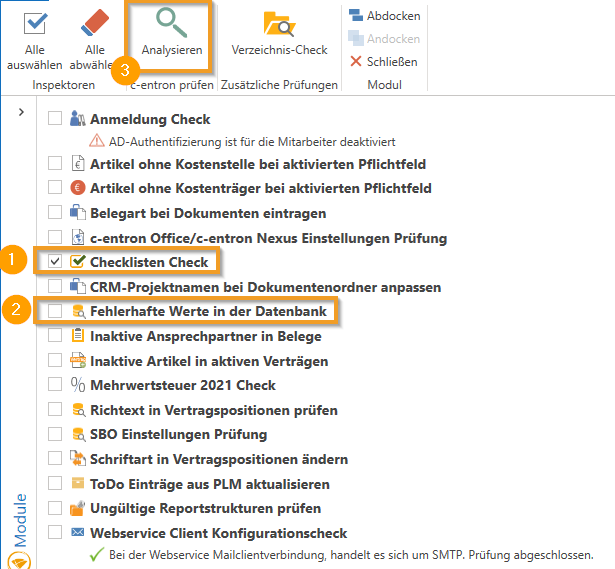 In the "c-entron Inspector" module, there is a new button [Directory Check] in the ribbon/menu bar under the "Additional Checks" group. Since this process can take a long time, it is best to run it outside of core working hours.