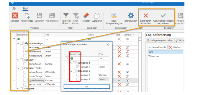 To export a template, select the "Export templates" function. A pop-up message will appear, which you should confirm by clicking "OK." Now select the templates you want to export using the checkboxes and click "Export selected templates." A save dialog box will open, allowing you to save the templates to your hard drive.