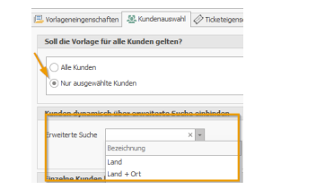 In the Internal tab, which is displayed when you have selected a template of type "Internal," you can define for the template itself which customer the ticket should be created for. This field is pre-filled with the values you entered in "Ticket Templates -> Settings -> Internal Ticket Templates."