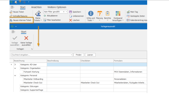 Internal tickets are created by default for an internal user in your company. You can configure the default settings in the ticket templates under Settings. To do this, go to internal ticket templates and select the default processor (e.g., Support, Orga, etc.). It is also possible to make subsequent changes to individual internal tickets. For more information, see the section: "Internal."