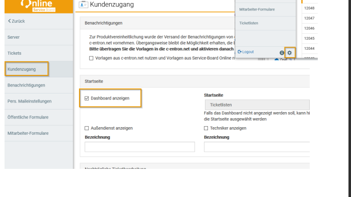 Log in as an internal user in Service-Board Online, then go to Settings (gear icon) in the lower left bar: There, select the Show Dashboard function.