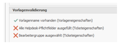 The template validation section shows you which necessary elements have already been set in the ticket creation process and which are still missing.