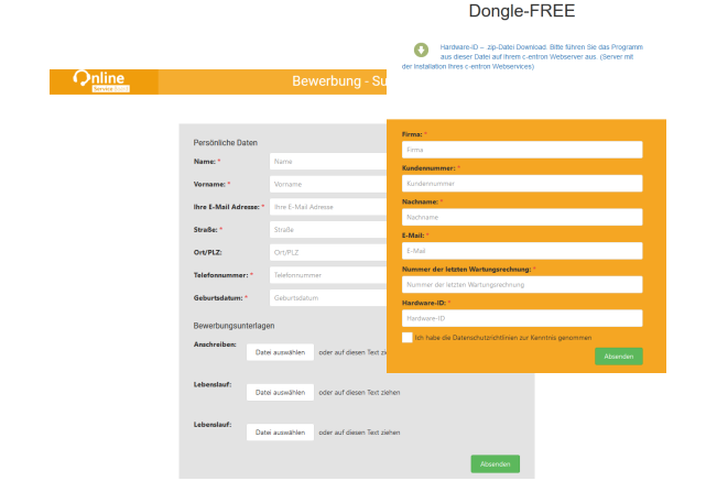 Public web form – can be published on a website Possible examples that are currently in use: c-entron OSID registration / Dongle Free, as well as applicant management