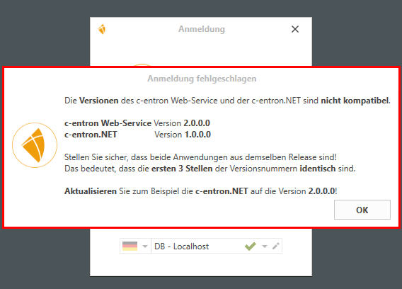The first three digits of the version numbers of the web service and c-entron.NET are now checked. If these differ, the user will receive this message when logging in and will not be able to log in.