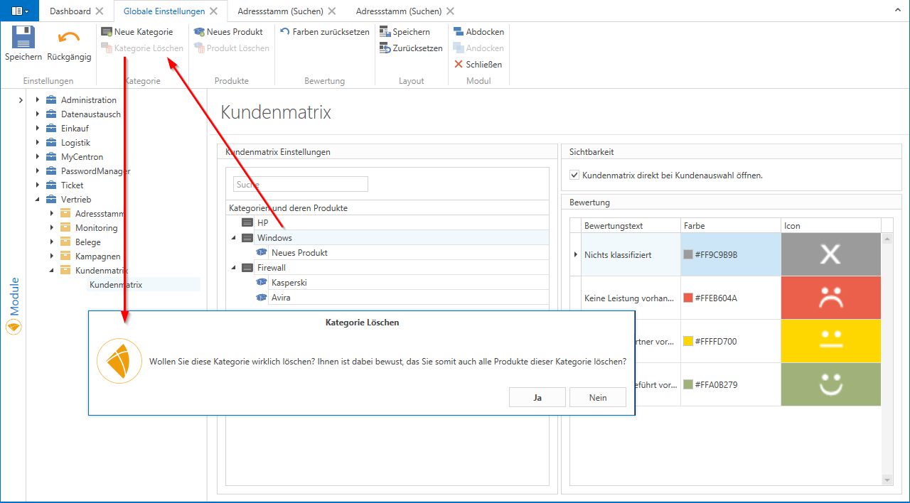 Under Global Settings - Sales - Customer Matrix, categories and their products can be created in the "Customer Matrix Settings" area using the [New Category] and [New Product] buttons.
