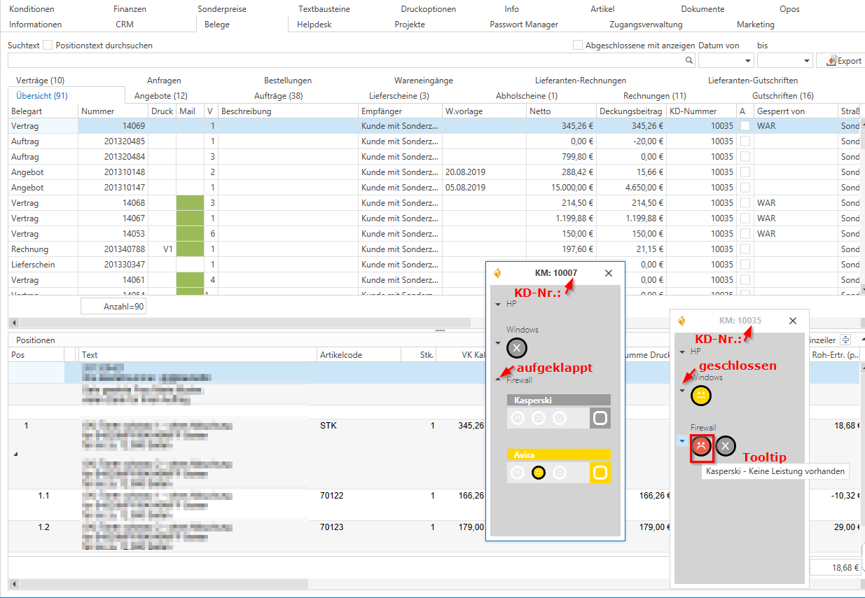 Overview showing the listed categories with a summary of the customer's rating based on rating smileys. A tooltip displays the product name and rating. If there are two open address masters and customers, the customer matrices must be distinguished by customer number.