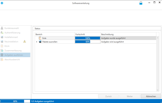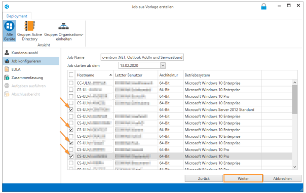 The "Deployment" menu item under [Install directly] allows you to compile software packages individually for devices and roll them out there once. In the "Software distribution" module, select your previously inventoried customers and confirm with [Next]..