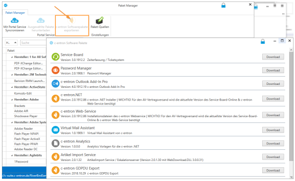 For historical reasons, there is not yet an MSI installer for all c-entron products, but you can also download them via the "Package Manager," unzip them, and then manually exchange them on the devices/servers. To do this, open the "Package Manager" and select the "Export c-entron software packages" function