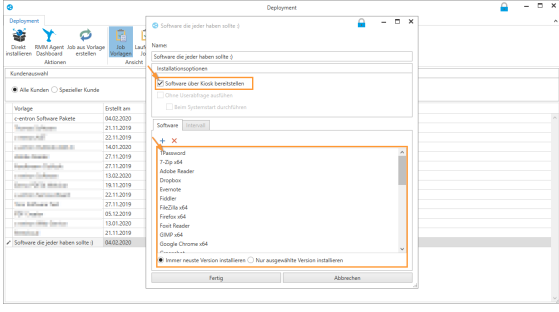 To do this, create a new "Job Template" via [Create New Template], activate the "Deploy software via kiosk" property, and select the software packages to be deployed: