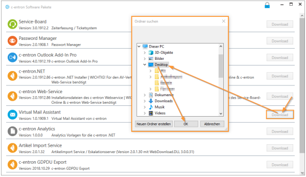 In this overview, you can now download the desired packages locally to the client using the [Download] button and then distribute the files manually from there.This can be done with all available software packages. Case study: You want to update Virtual Mail Assistant. Download the file using [Download], and a "Find Folder" dialog box will open in which you must specify the storage location for the download and confirm with [OK]