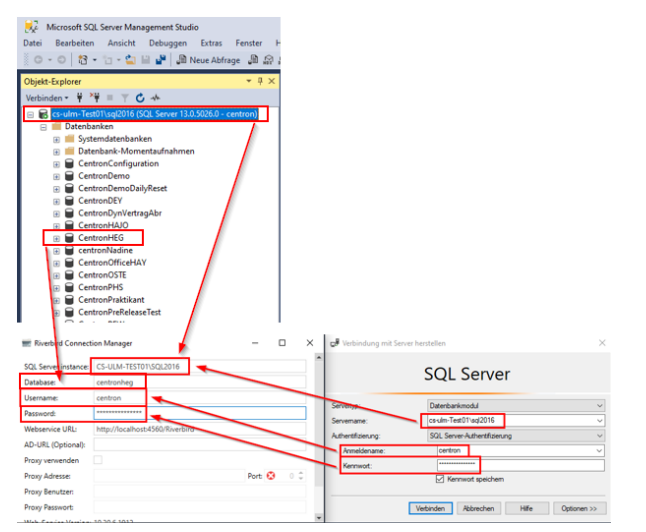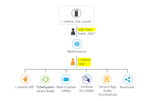 A common mistake when setting up the Riverbird WebService is using incorrect login details. To clarify: when you "set up" the WebService, you connect it directly to the c-entron database. To do this, you must use the login details for SQL Management. The database user "bbo" was most commonly used for this purpose, and in some cases the user "sa" was also used. In order to then be able to use Riversuite via the WebService, a c-entron user must log in as a user, as on a c-entron module