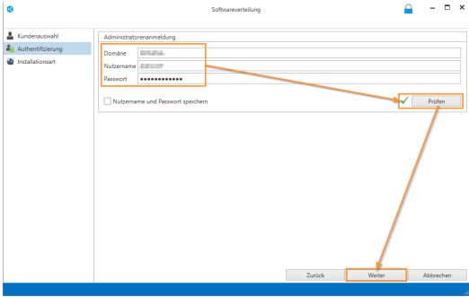 ...under Authentication, enter your domain and a user with administrative privileges in the domain, confirm this with [Check], and if successful, click [Next]