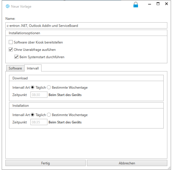 In the "Interval" tab, you can define a cyclical interval for installing the packages. Alternatively, you can specify in the "Installation options" that the installation should also be "Executed without user prompt" and optionally "Executed at system startup." In this case, the time settings in the "Interval" tab are inactive: