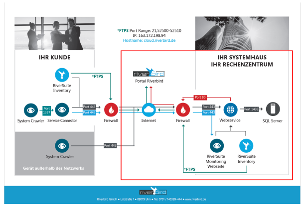 The graphic illustration shows how the communication paths of the individual components run, which standard ports are used, and where firewalls may need to be configured to allow traffic through