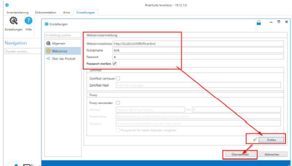 First, open the settings and link RiverSuite Inventory to the Riverbird WebService. To do this, enter the URI of the previously configured Riverbird WebService as the WebService address. The username and password must correspond to an active centron user. This user must have at least the "Customers General" and "Monitoring" rights. You can create a dummy user in c-entron for this purpose; however, you should refrain from using system users such as RMM users or admins, as this could lead to conflicts in the process.