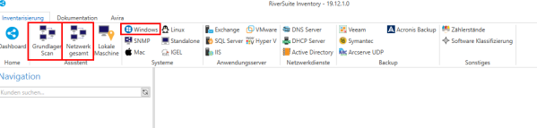This completes the basic configuration of RiverSuite Inventory. Next, perform an inventory of your domain on your own customers. Select your own customers using the search mask and perform the basic scan. It is sufficient to inventory the Windows systems; more experienced users can also inventory the entire network.