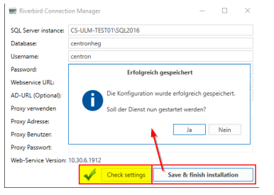 After successfully checking the settings, you can save the configuration and complete the installation. Confirm the subsequent message by clicking [Yes] to start the WebService.