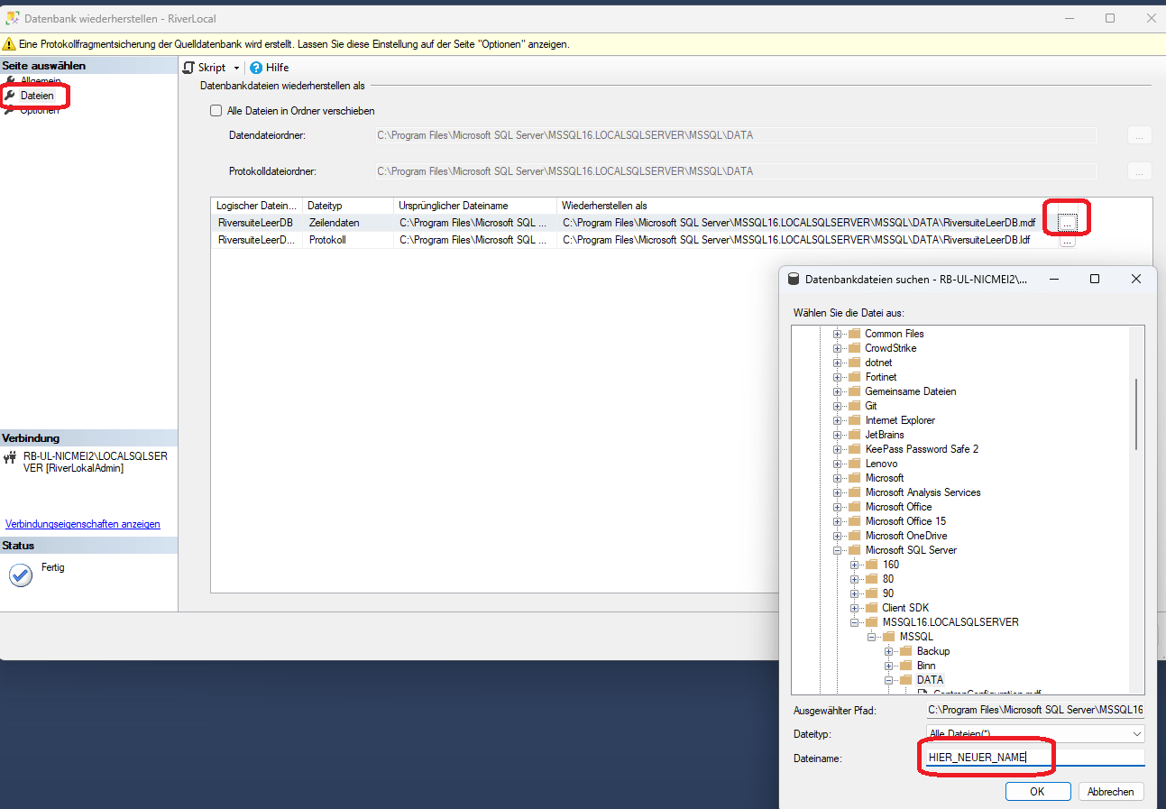 Adjust the names of the database files as follows: