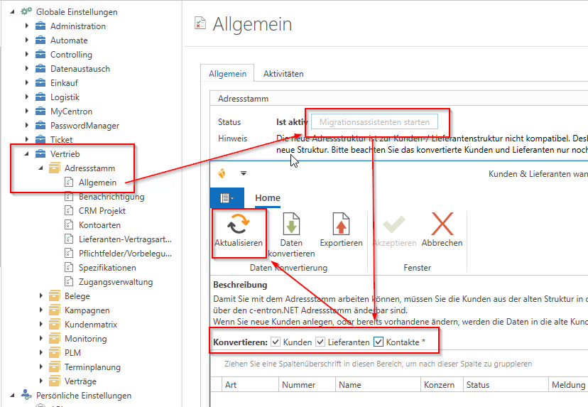 Log in to c-entron.NET via the database connection. Start the "Migration Wizard" in the global settings under "Sales -> Address Master -> General" and check whether the account you are looking for is displayed after activating the account type for this "account" and then "Updating." If this is the case, you can transfer this and any other accounts displayed by clicking on "Convert Data."