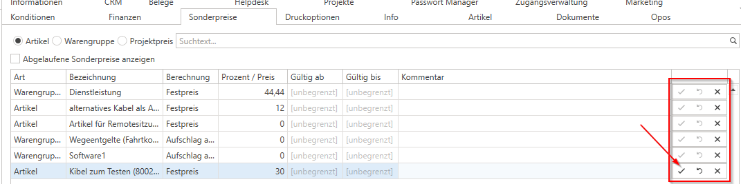 After configuration, please check whether you have saved the special price by clicking on the confirmation check mark at the end of the line. This must be done for special prices. It is not sufficient to simply save the account.
