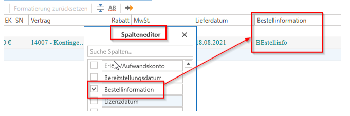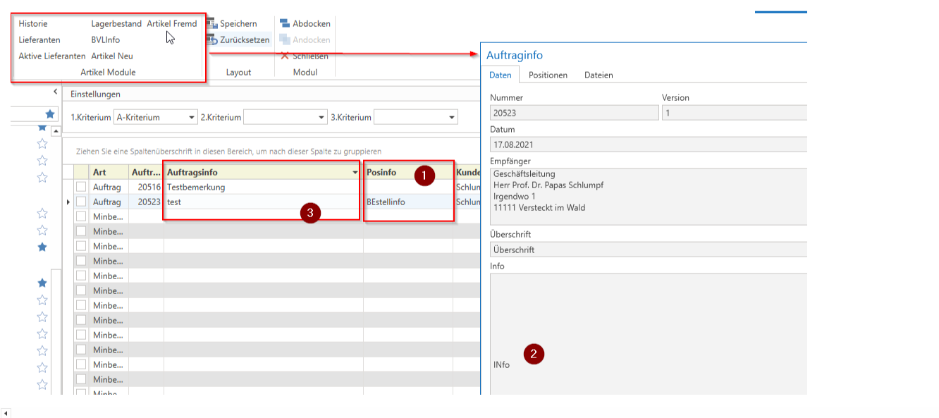 2) You can enter information in the order under "Document details -> Info." This will be displayed in the BVL in the "Order info" field as "Info." However, this field must be activated for this to work.