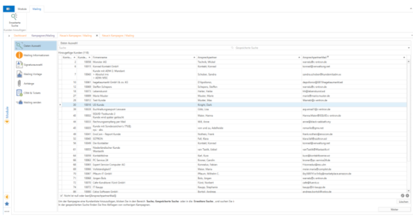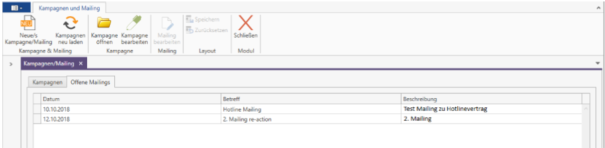 After opening, all campaigns/mailings carried out in c-entron.NET are displayed in individual tabs. You can filter using the columns.