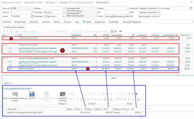 The bill of materials then contains the service item for the time with the "normal pricing logic" and the "service compensation item," which was also stored in the global settings for this purpose.