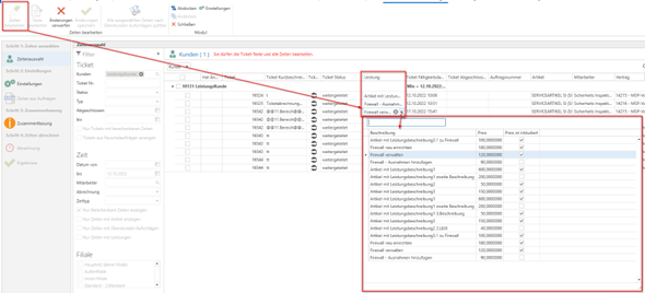 In simplified ticket billing, the "Service" column has been implemented for times. This allows you to search and filter by the "services" for each time. It is also possible to remove the service for the respective time by clicking on "Edit times" or to select another service for this customer from the drop-down menu.