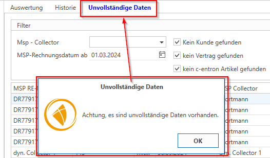 In addition, you can activate the setting "Display a message if data is incomplete." This causes a pop-up to appear when you "Reload" the evaluation if there is data in one of the imports that has not yet been completely recorded, e.g., some customer or article data from the import has not yet been assigned to the corresponding c-entron customer or article. Or the assigned article could not be found in any contract of the assigned customer. This serves as a check to ensure that no data is "lost" or cannot be evaluated.