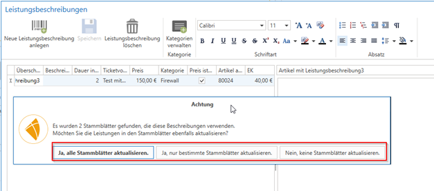 If you now change one of the existing service descriptions or add a new service description to existing items that already have at least one service description, a query appears asking whether this should also be updated in the existing master sheets.