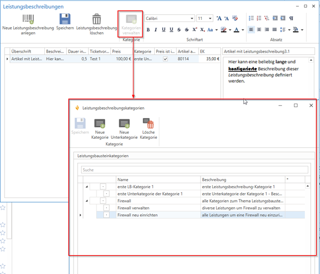 Here you can now manage the service descriptions for this item and, if necessary, "categories" for the service descriptions.