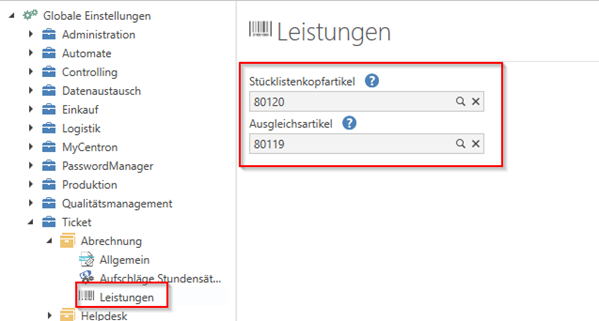In the global settings, two items must be assigned under "Ticket -> Billing -> Services":