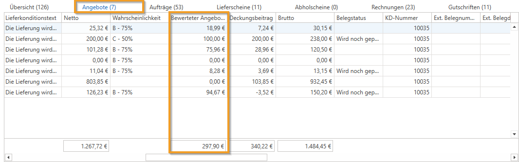This Probability value is now also available in the Document overview is displayed and serves as the basis for calculating the evaluated bid value. In the column ""Evaluated bid value" this value is calculated by multiplying the net offer value by the probability value and is then displayed.