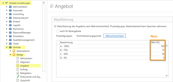 As part of the latest update, the following changes have been made to the global settings under "Sales -> Documents -> Quotations," the functionality of the "Probability" was added. A new column "Value" has been introduced, into which a percentage probability value can be entered. The default value is 0, but this must be adjusted individually by users to represent the actual probability of an offer being accepted.