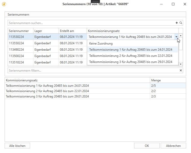 Assignment to partial picking is done by double-clicking or via the right-click menu. After assignment, the serial number jumps to the upper list. There, it can be removed again if necessary, which means that it only disappears from partial picking but remains available for the order.
