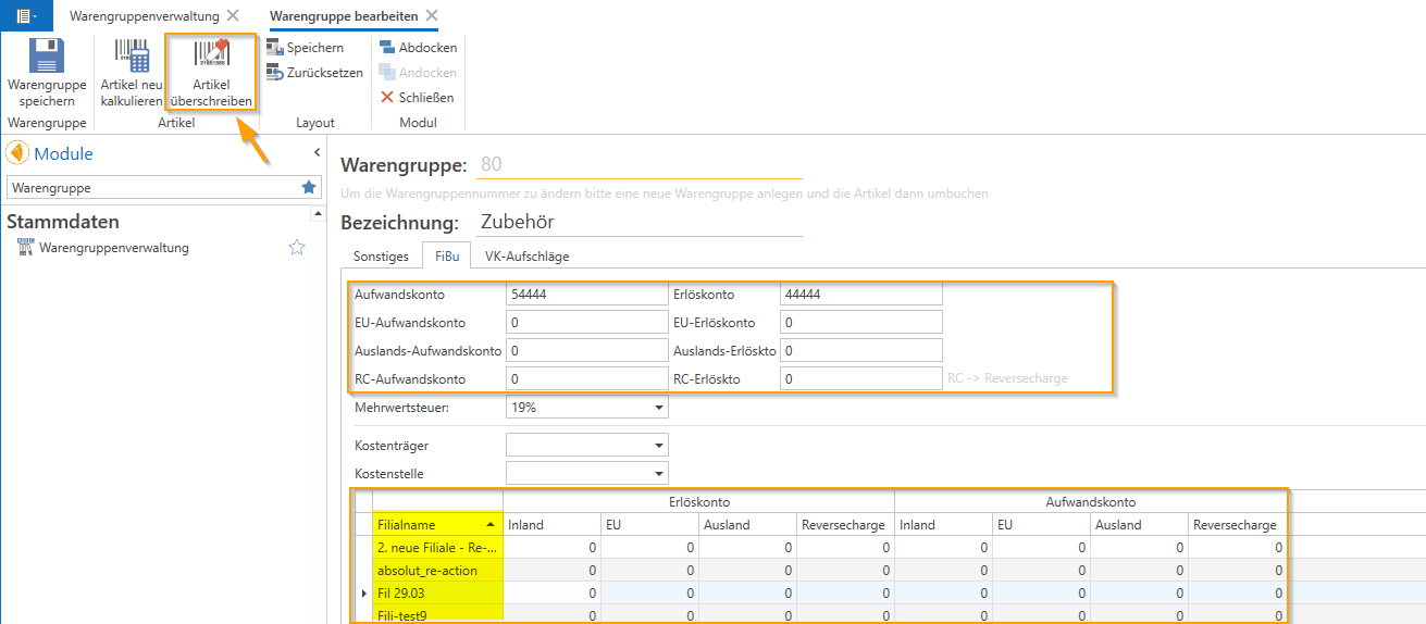 In the "Product Groups" module, you can assign a revenue and expense account (also for individual branches) to entire product groups and/or sub-product groups in the "Financial Accounting" tab and update these for the items using the [Overwrite Item] button: