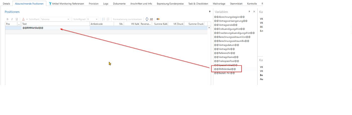 In the contract, use the variable @@RMMArticle@@ under the items. When