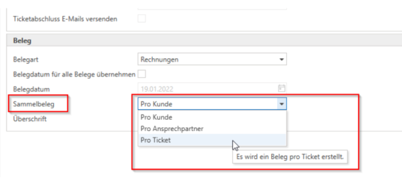 In the "Settings" for simplified ticket billing, the option "per ticket" has now been implemented in the "Collective receipt" setting. If this option is selected, a separate receipt is created for each ticket.