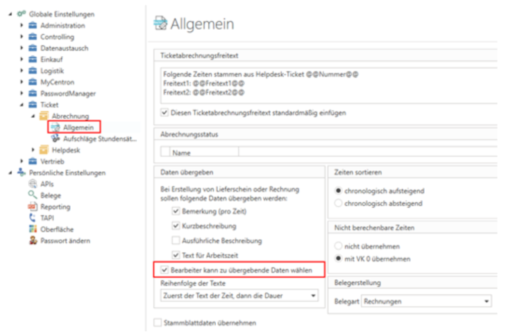 These settings can also be configured under Administration - Global Settings - Ticket - Billing - General and deactivated by unchecking the box next to "Agent can select data to be transferred." This prevents this setting from being edited in ticket billing (and it appears grayed out).