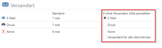 If "None" is selected, this customer does not have a default shipping method. Here, you can select a shipping method for these customers on the right. The other customers will receive the invoice by default, unless the "Apply shipping method to all" checkbox is selected, in which case everyone will receive the invoice using the selected shipping method.