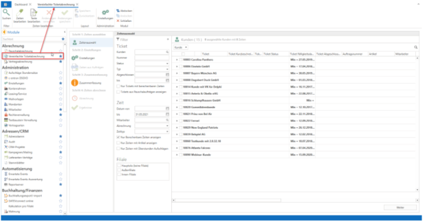 The main window in the "Time selection" menu item offers various filter functions divided into tickets, times, and branches. Tickets can be filtered by customer, number, status, type, and ticket completion date (from/to). This allows you to filter tickets according to certain criteria, and these times are displayed on the right-hand side of the table. The Time filter allows you to filter times within a certain period, by specific employees (assignment according to the item for which the time was recorded), by billing status, and/or by a specific time type. In addition, you can decide whether you want to display "only billable times," "only times with items," and/or "only times with overtime surcharges."