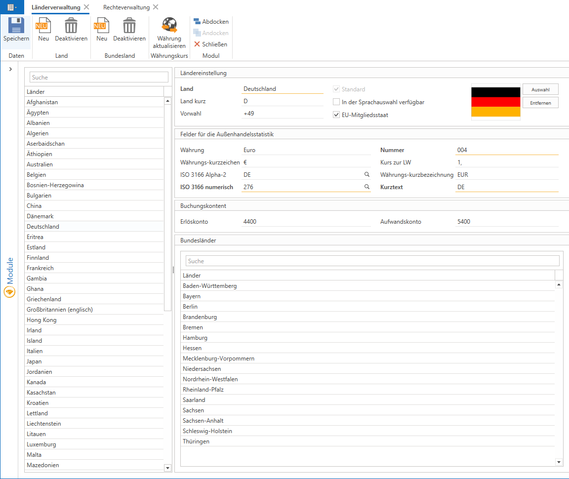 On the left-hand side, you will see a list of countries, with Germany selected by default. Almost all common countries are already included, and you can simply select the desired country to check or change its data. Using the "New" and "Deactivate" buttons, you can customize this list so that only the countries you need for your customers, suppliers, and manufacturers are displayed.
