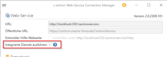 Please also check in the "c-entron Connection Manager" of your web service whether the checkbox for "Activate integrated services" is checked