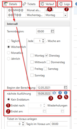 In the "Interval" section, also check whether the task has an entry under "Ends after x repetitions" (screenshot, point 1) or under "Ends on" (screenshot, point 2) and what is displayed as "Next execution" (screenshot, point 3). By clicking on the "?" (screenshot, point 4) and the "i" (screenshot, point 5) next to the "Next execution" field, you can display the last and next execution dates.